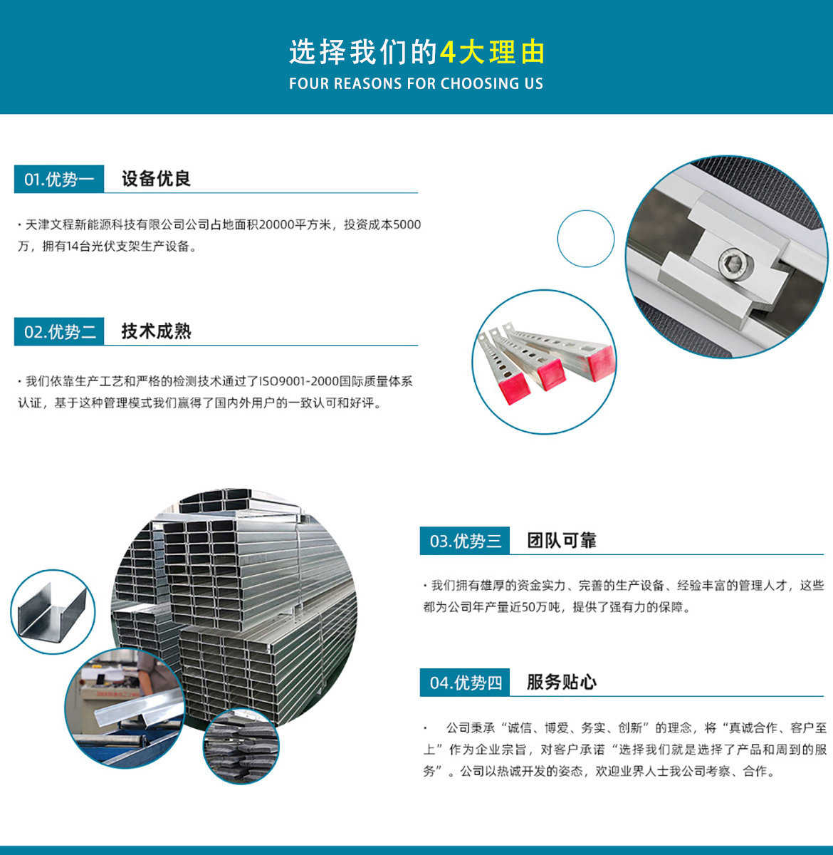 天津文程新能源科技有限公司成立于2021年,是專注于集中式、分布式、漁光互補(bǔ)和農(nóng)光互補(bǔ)等清潔能源發(fā)電的綜合性企業(yè) 公司是集設(shè)計(jì)、研發(fā)、生產(chǎn)、制造為一體的綜合型企業(yè)。公司占地面積20000平方米,注冊(cè)資金5000萬(wàn)元整。公司坐落于華北鋼鐵重鎮(zhèn)--大邱莊,距天津市區(qū)50公里、鄰104和205國(guó)道及京滬高速,交通十分便捷。 本公司擁有三個(gè)生產(chǎn)車(chē)間,其中兩個(gè)冷彎型鋼車(chē)間,一個(gè)鋅鋁鎂型鋼車(chē)間,擁有自動(dòng)冷彎成型機(jī)10條,自動(dòng)數(shù)控沖孔機(jī)10條以及焊接加工等設(shè)備。主要生產(chǎn)產(chǎn)品有:太陽(yáng)能光伏支架、各種規(guī)格的C/Z/U型鋼、抗震支架、管廊支架及整套配件等。